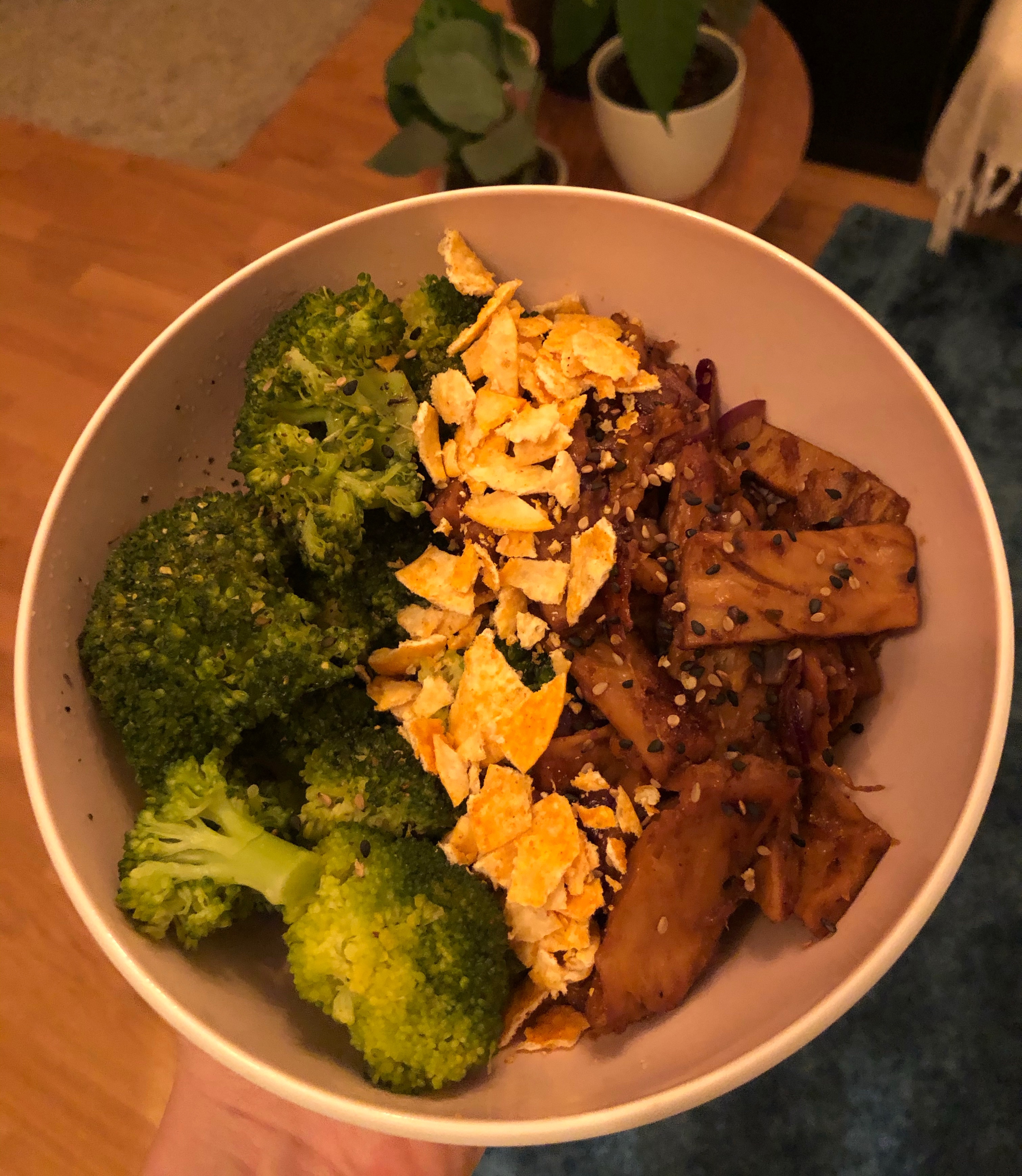 3. Eine Schüssel bereithalten. Zuerst Broccoli auf einer Seite anrichten und ein wenig salzen. Auf die andere Seite die gebratenen Pulled Chunks geben und das Gericht mit etwas Sesam anrichten.