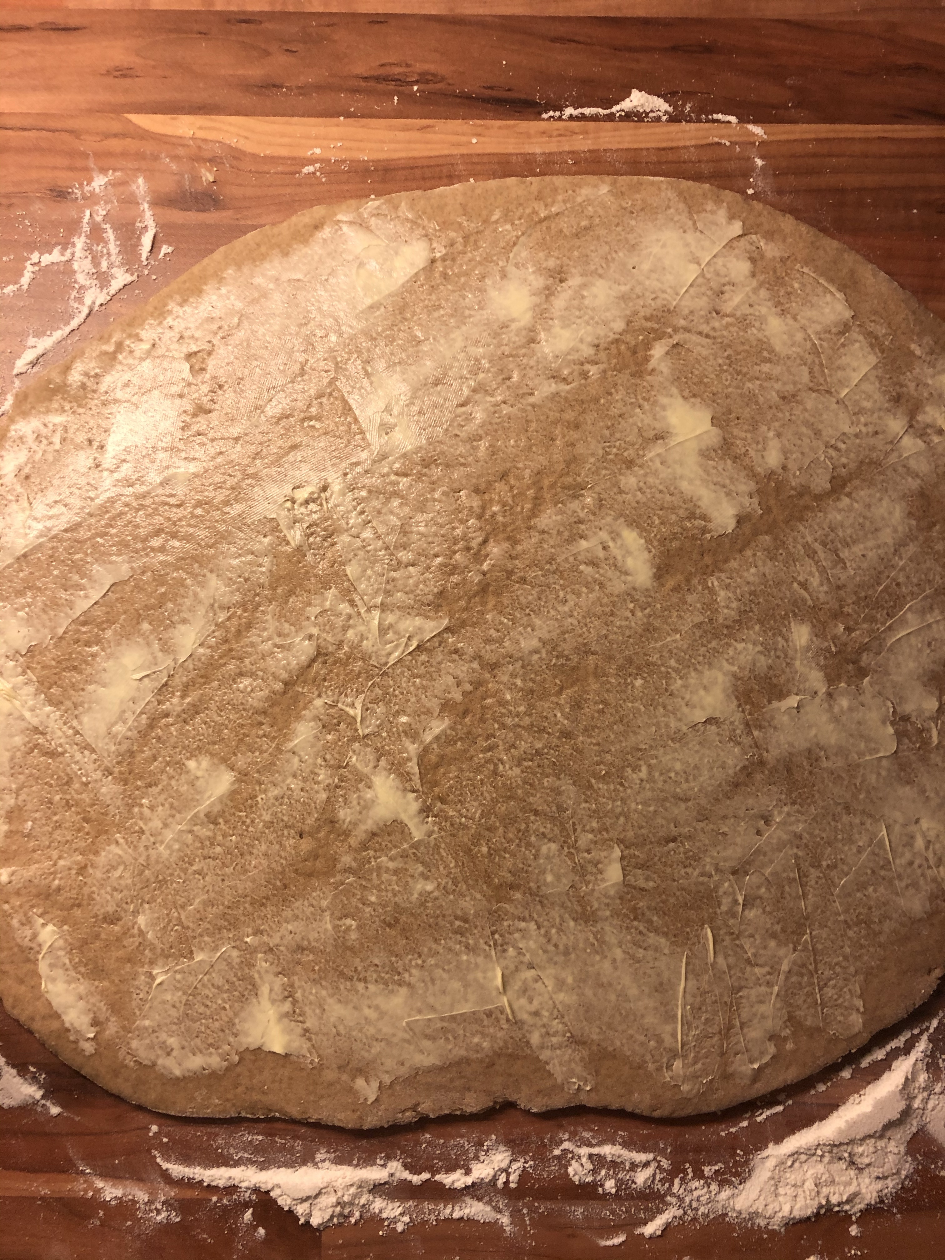 - Auf den ausgerollten Teig mit einem Buttermesser die weiche Butter aufstreichen – so als würde man sich ein Butterbrot schmieren. Der Teig muss überall gut mit Butter bedeckt sein.