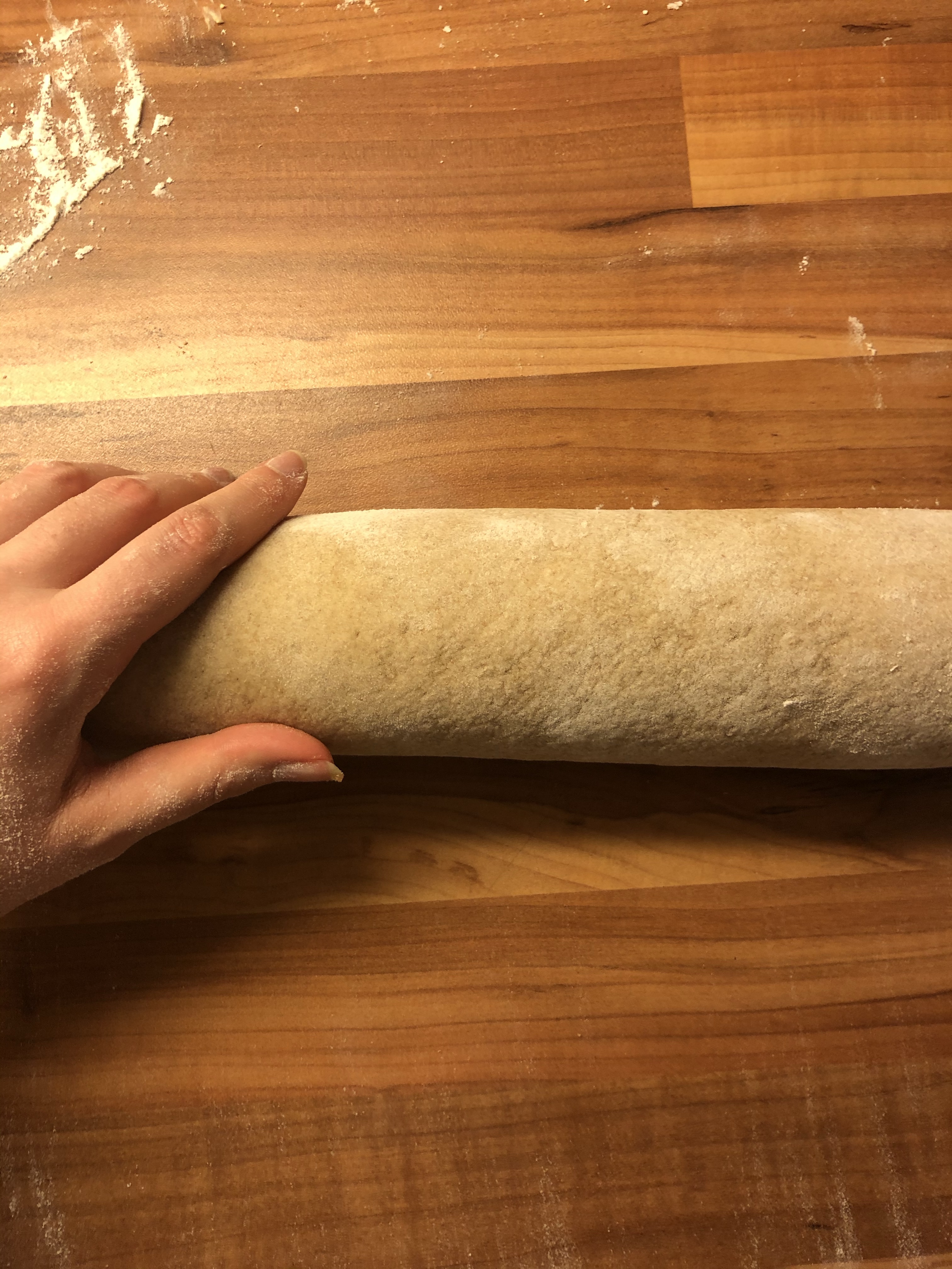 - Den Teig auf der Längeren Seite einrollen bis eine lange Rolle entsteht.